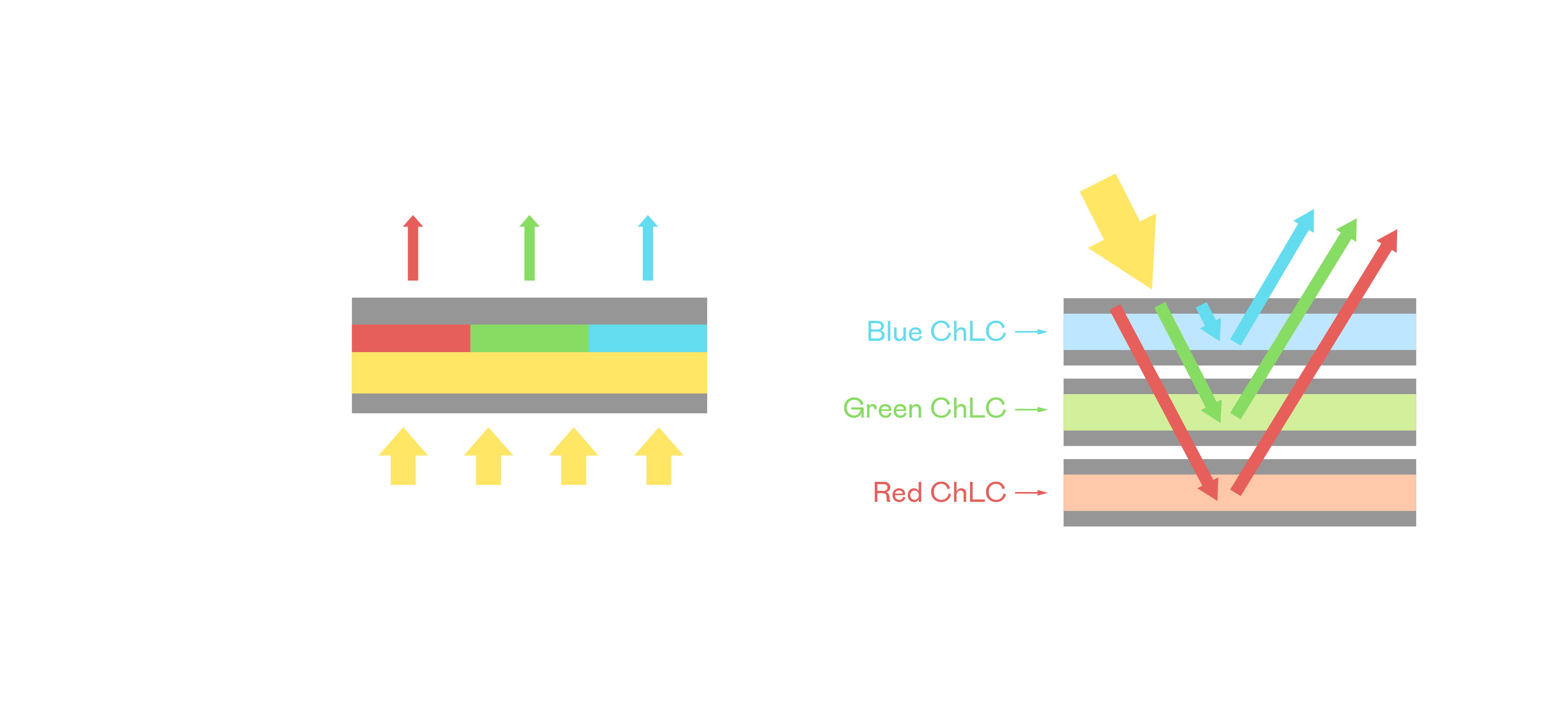 小勐拉99厅胆固醇液晶显示器是由红、绿、蓝三层胆固醇液晶面板堆叠而成,并采用无彩色滤光片设计,减少环境光在反射过程中的损耗。